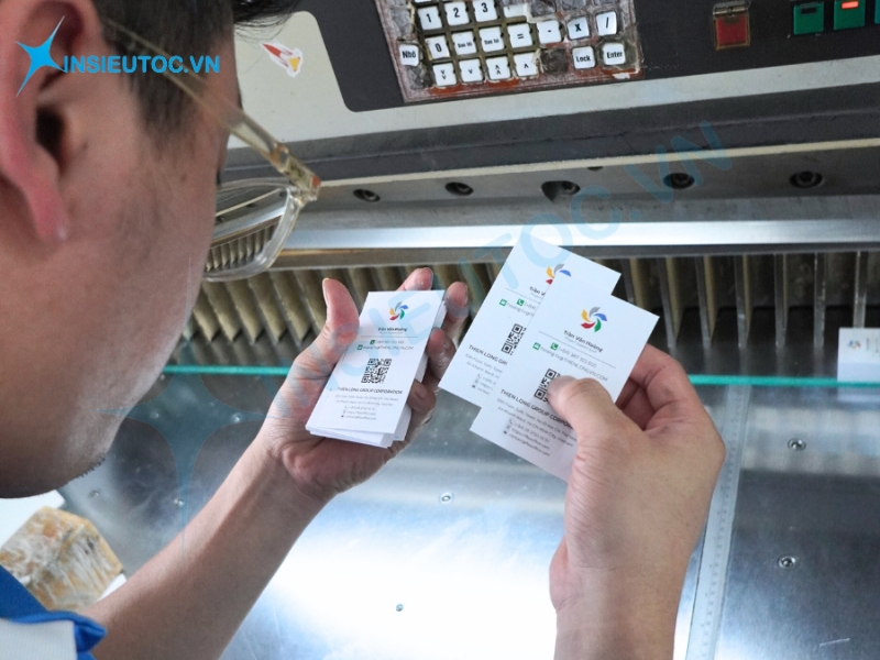 - Kỹ thuật cắt xén chuẩn xác: Name card có kích thước nhỏ nên đòi hỏi độ chính xác cao. Tại In Siêu Tốc, chúng tôi sử dụng máy cắt lập trình tự động, đảm bảo thành phẩm vuông vức, không bị lệch biên hay tưa mép giấy.